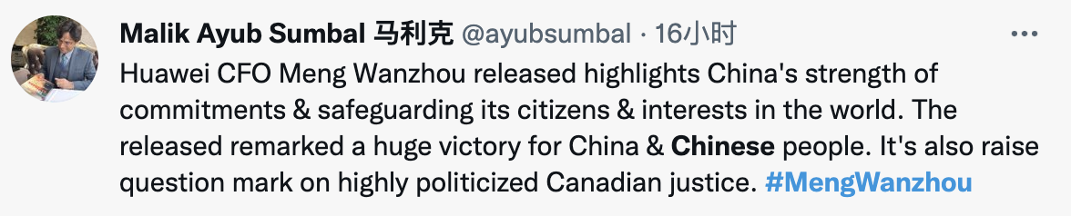 网友Malik Ayub Sumbal 马利克:孟晚舟的发言凸显了中国维护公民安全和利益的承诺与力量,这是中国和中国人民的巨大胜利。