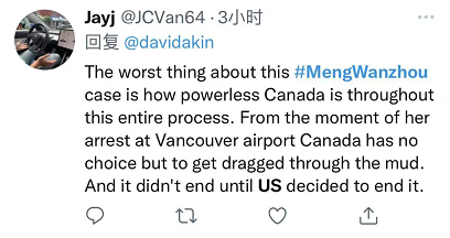 网友Jayj:这个事件最糟糕的地方是,在整个过程中,加拿大是多么的无力。从孟晚舟在温哥华机场被捕的那一刻起,加拿大别无选择,只能被拖入泥潭,直到美国决定结束这场战争。