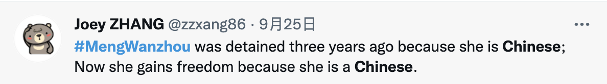 网友Joey ZHANG:孟晚舟三年前被捕,因为她是中国人。现在能够回家,也因为她是中国人!