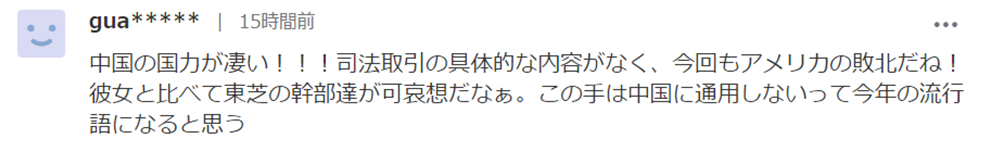 孟晚舟获释引发日本网友的热议,有网友表示,“中国的国力真厉害!虽然还没有司法方面的具体内容,但是这次美国一败涂地!和她(指孟晚舟)相比,东芝的干部们真是可怜。‘中国人不吃这一套’想必会成为今年的流行语。”