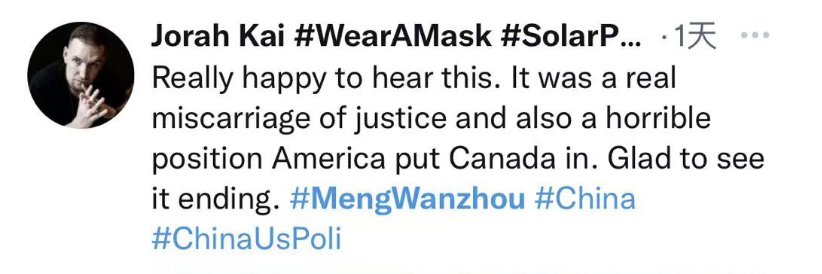 网友Jorah Kai:真的很高兴听到孟晚舟回国的消息。孟晚舟事件是真正的司法不公,美国把加拿大置于可怕的境地。很高兴看到事件结束了。