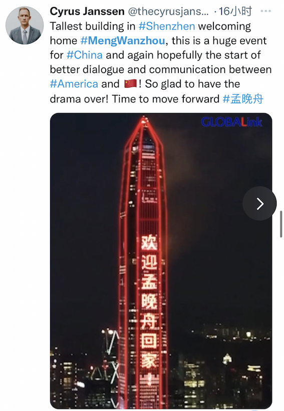 网友Cyrus Janssen:深圳第一高楼欢迎孟晚舟回家。这是中国的一件大事。我也再次希望中美能进行更好的对话和沟通。很高兴这件事结束了,是时候继续前进了。