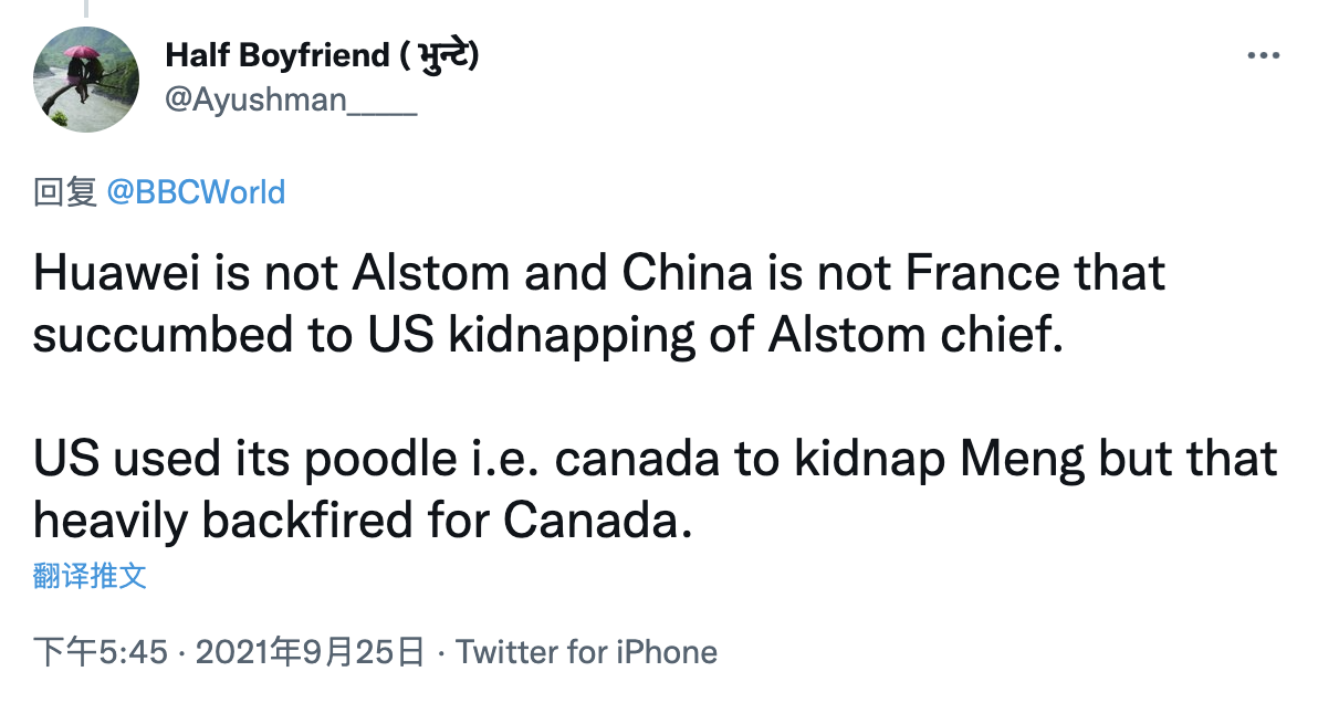 网友Half Boyfriend:华为不是阿尔斯通,中国也不是因美国绑架阿尔斯通首席执行官而屈服的法国。美国用它的贵宾犬——加拿大绑架了孟,但这让加拿大自食其果。