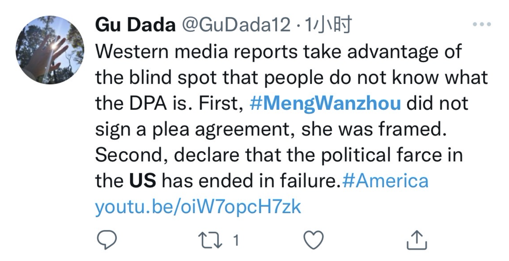 网友Gu Dada表示,第一,孟晚舟是被诬陷的;第二,此事宣告了美国的政治闹剧以失败告终。