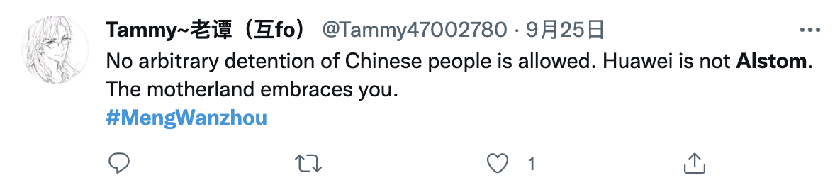 网友Tammy~老谭:没有中国人可以被任意拘留。华为不是阿尔斯通。祖国母亲保护你。