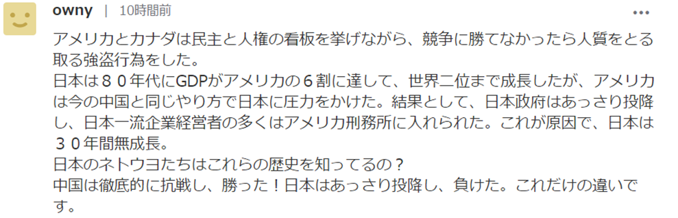 日本网友对比了中日两国在应对外界压力上的差距,表示,美国和加拿大打着“民主”和“人权”的幌子,可一旦在竞争中无法胜出,就采取掠夺人质的强盗行为。上世纪80年代,日本的GDP就已经达到美国的六成,成为世界第二。那时的美国对日本施加压力,其手法就如同今天对待中国一样。中国不懈抗争到底,最后取得胜利!日本轻而易举投降,输了。这就是差距。