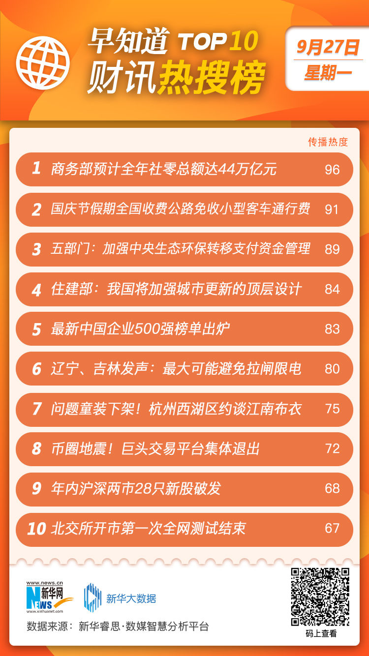 【早知道·财讯热搜榜TOP10】运用新华睿思大数据平台,从各媒体信源数据抓取最近24小时财经新闻、事件、话题传播热度排行。