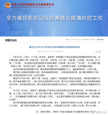 截至9月26日24时,据31个省(自治区、直辖市)和新疆生产建设兵团报告,现有确诊病例1012例(其中重症病例11例),累计治愈出院病例90402例,累计死亡病例4636例,累计报告确诊病例96050例,现有疑似病例2例。累计追踪到密切接触者1188820人,尚在医学观察的密切接触者20176人。