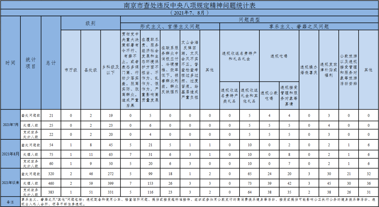 为掌握南京市贯彻落实中央八项规定精神情况,南京市纪委监委在各板块、市级机关、市属单位建立了落实中央八项规定精神情况月报制度,定期向社会发布南京市查处“四风”问题情况,持续释放落实中央八项规定精神越往后盯得越紧、执纪越严的强烈信号。2021年以来,截至8月31日,南京市查处违反中央八项规定精神问题情况如下。