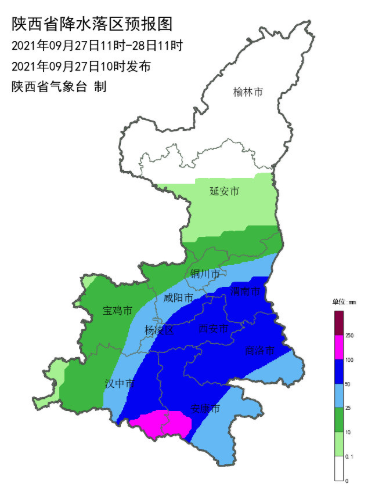 连日来,陕西大部分地区持续降雨。陕西省气象台2021年9月27日10时30分继续发布暴雨黄色预警:预计9月27日11时至9月28日11时关中中东部、陕南大部有大到暴雨,其中渭南大部、铜川南部、宝鸡东部、杨凌、咸阳南部、西安、汉中东部、安康、商洛有大雨(25~49毫米),西安、渭南南部(临渭区、大荔、蒲城、华州、华阴、潼关)、汉中东部部分(南郑、洋县、西乡、佛坪、镇巴)、安康中北部(汉滨区、宁陕、石泉、汉阴、紫阳、旬阳、岚皋)、商洛中北部(商州区、柞水、镇安、洛南、山阳、丹凤)有暴雨(50~80毫米),局地(镇巴、紫阳)有大暴雨(100~130毫米)。过程期间伴有短时暴雨,最大小时雨强20~40毫米,局地可达50毫米以上,上述地区的相邻县区也可能出现强降水,需高度关注。