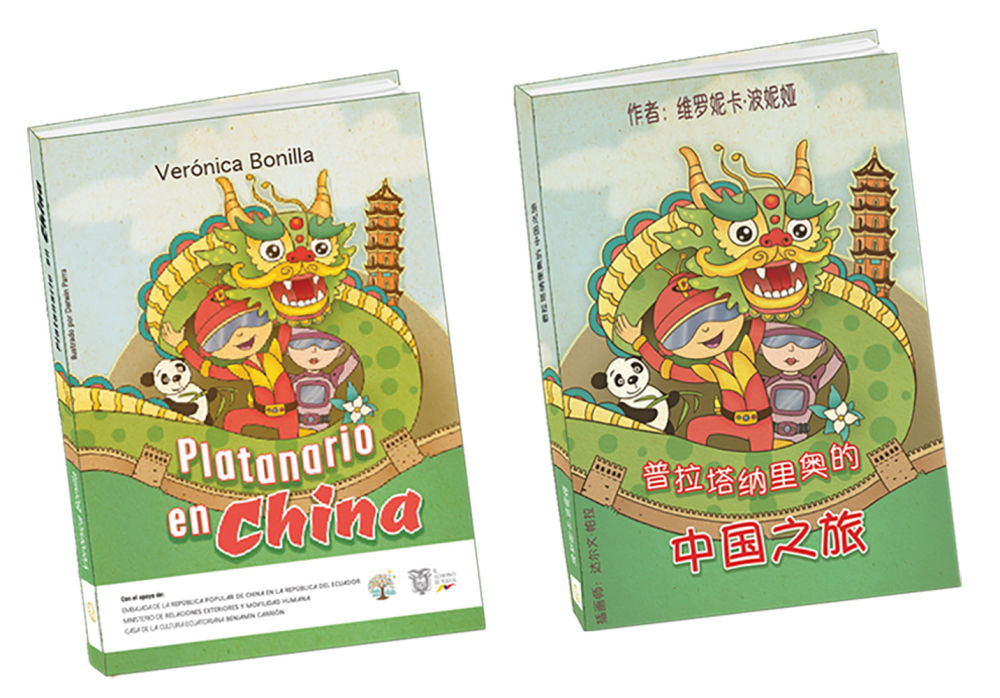 厄瓜多尔作家博尼利亚的代表作《普拉塔纳里奥的中国之旅》中文、西班牙文版封面。(新华社发)