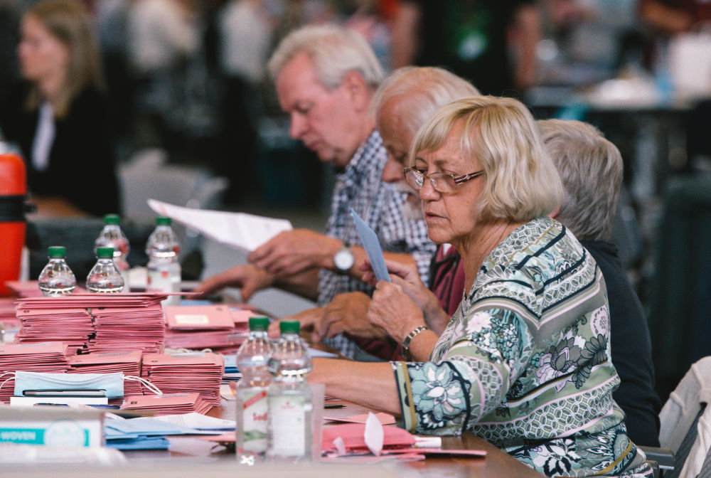 9月26日,工作人员在德国科隆一处计票中心清点选票。新华社发(唐颖摄)