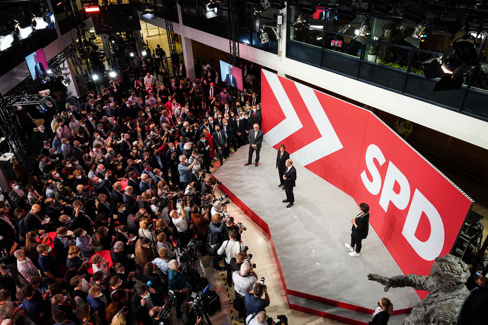 9月26日,在德国首都柏林社民党总部,社民党总理候选人朔尔茨(左二)参加集会。新华社发(斯特凡·蔡茨摄)