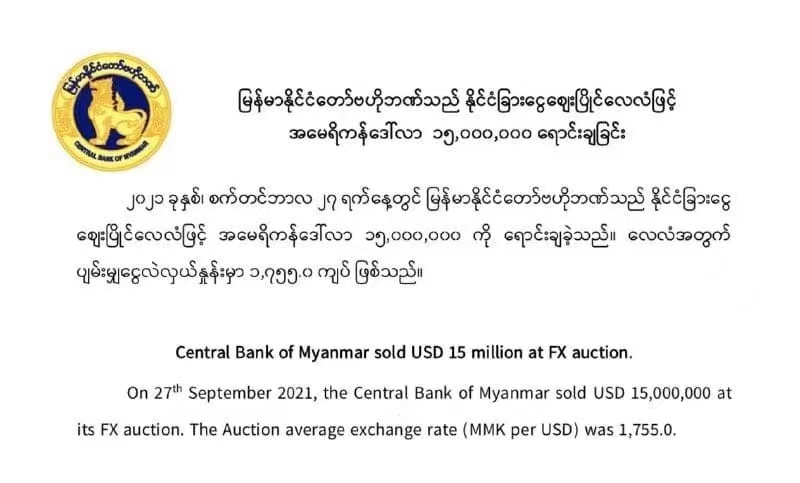 当地时间9月27日,缅甸央行以1755∶1的价格再次向市场投放1500万美元,以平衡汇率。至此,缅甸央行自今年年初至今共分36次向市场投放了1.848亿美元,其中进入9月以来共分5次向投放了6300万美元,突破缅甸有史以来单月向市场投放外汇最高纪录。