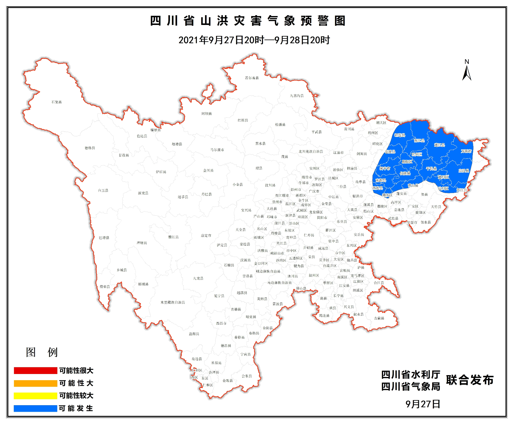 9月27日17时,四川省水利厅联合四川省气象局发布山洪灾害蓝色预警,27日20时至28日20时,达川、通川、开江、宣汉、万源、巴州、恩阳、南江、平昌、通江、旺苍、苍溪、顺庆、西充、南部、阆中、仪陇、营山、蓬安等县(市、区)可能发生山洪灾害。这已是四川连续四天发布山洪灾害蓝色预警。