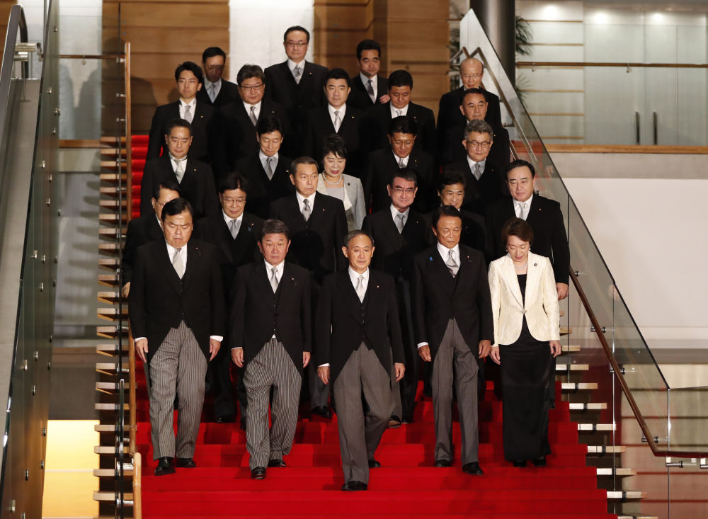 2020年9月16日,日本执政党自民党新总裁菅义伟(前排中)在临时国会首相指名选举中顺利当选首相,并组建内阁。图为菅义伟率阁僚走下楼梯。(新华社发,加藤一生摄)