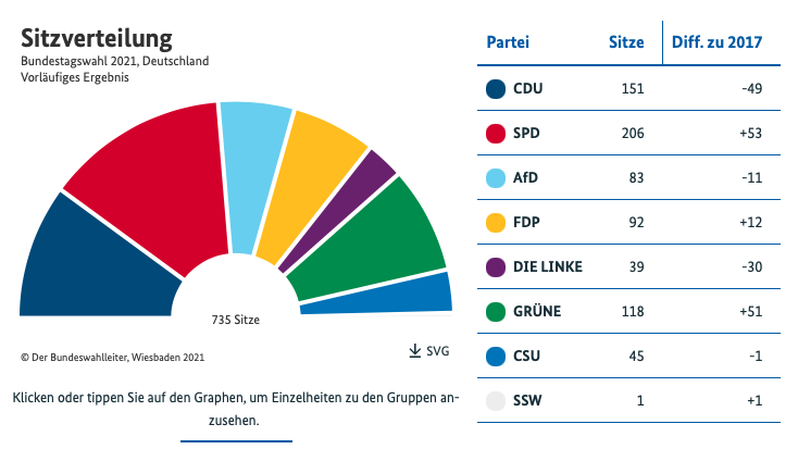 △德国2021年联邦议院选举初步官方结果显示的议院席位分布(来源:德国联邦选举委员会)