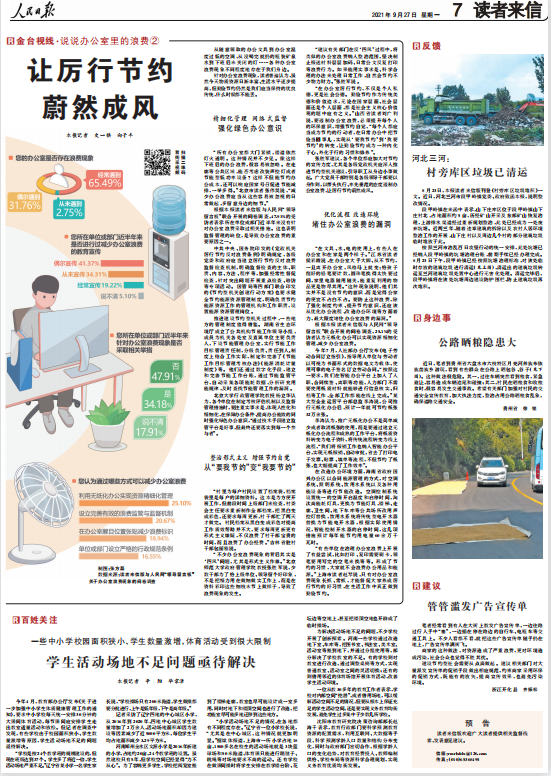 “有些单位在治理办公室浪费上开展了有益尝试,比如打印、复印需要刷卡,领笔要用写完的空笔来换等等。形成了节约的习惯,大家就不会浪费办公用品和能源。”上海市读者赵琴说,只有对办公室浪费现象长抓、常抓,才能督促大家养成厉行节约的好习惯,在生活工作中真正做到勤俭节约。
