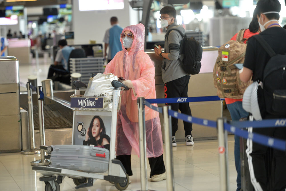 2020年3月16日,一名身披雨衣的乘客在泰国曼谷素万那普国际机场等待值机。新华社发(拉亨摄)