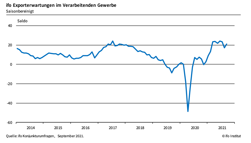 根据德国智库伊弗经济研究所当地时间9月27日发布的数据,今年9月,德国制造业出口预期指数继此前两个月持续下跌之后重新回升,从17.0点环比增长至21.0点。伊弗经济研究所所长克莱门斯·菲斯特当天在一份声明中指出,虽然受到原材料和中间产品采购危机的影响,但德国工业出口出人意料地表现强劲。