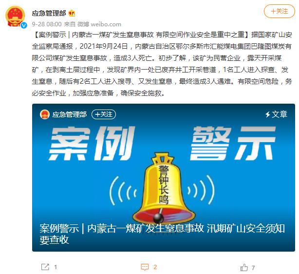 央视网消息:据@应急管理部 微博9月28日消息,国家矿山安全监察局通报,2021年9月24日,内蒙古自治区鄂尔多斯市汇能煤电集团巴隆图煤炭有限公司煤矿发生窒息事故,造成3人死亡。初步了解,该矿为民营企业,露天开采煤矿,在剥离土层过程中,发现矿界内一处已废弃井工开采巷道,1名工人进入探查、发生窒息,随后有2名工人进入搜寻、又发生窒息,最终造成3人遇难。