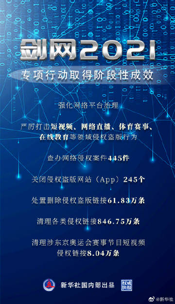 【#权威快报#|#剑网2021专项行动取得阶段性成效#】国家版权局、工业和信息化部、公安部、国家互联网信息办公室今年6月联合启动打击网络侵权盗版“剑网2021”专项行动,严厉打击短视频、网络直播、体育赛事、在线教育等领域的侵权盗版行为。截至目前,各级版权执法监管部门查办网络侵权案件445件,关闭侵权盗版网站(App)245个,处置删除侵权盗版链接61.83万条,推动网络视频、网络直播、电子商务等相关网络服务商清理各类侵权链接846.75万条,主要短视频平台清理涉东京奥运会赛事节目短视频侵权链接8.04万条。(记者史竞男,海报设计苗夏阳)