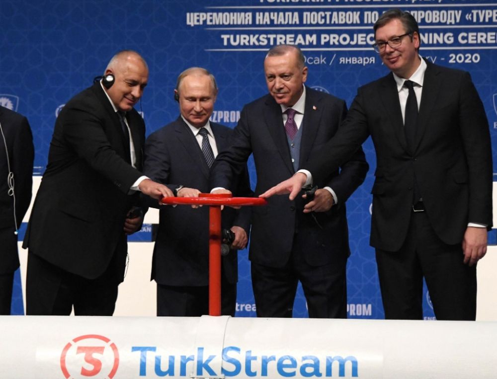 2020年1月8日,在土耳其伊斯坦布尔,土耳其总统埃尔多安(右二)、俄罗斯总统普京(左二)、时任保加利亚总理鲍里索夫(左一)与塞尔维亚总统武契奇参加“土耳其溪”天然气管道通气仪式。(新华社记者徐速绘摄)