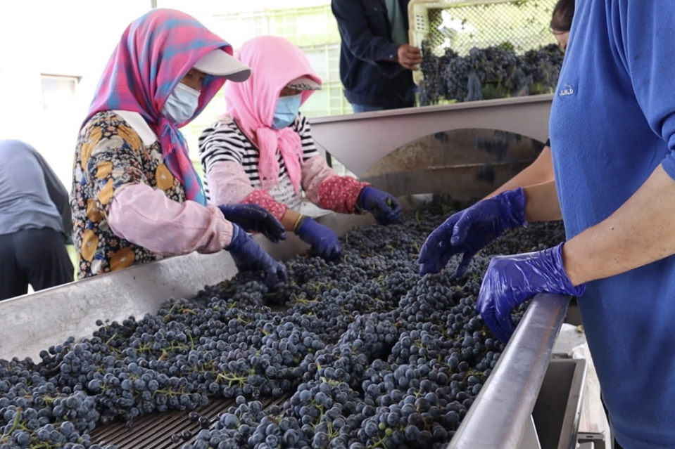 (工人们正在人工给葡萄摘梗 央视网记者 王静远 摄)