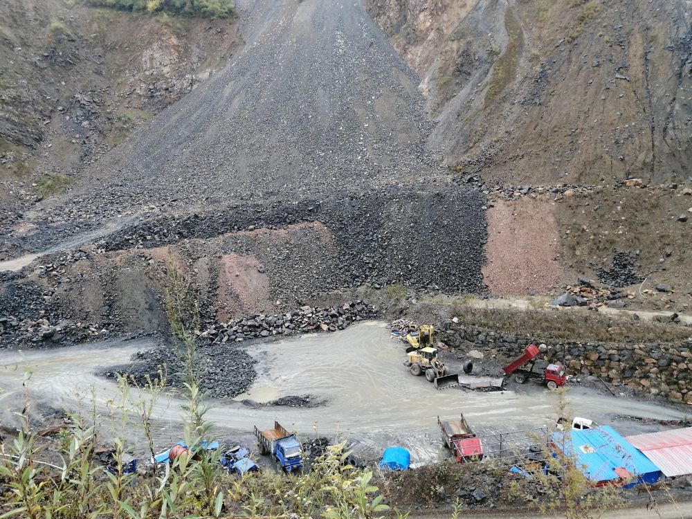 雨后的板石矿业矿区,道路坑洼泥泞,不时穿梭的卡车,将废石随意倾倒在矿坑周围。放眼望去,一些山体几乎一点植被都没有,黑乎乎一片;一些山体周边废石废渣倾泻而下,触目惊心。这与板石矿业宣传的“绿色矿山”形象大相径庭。