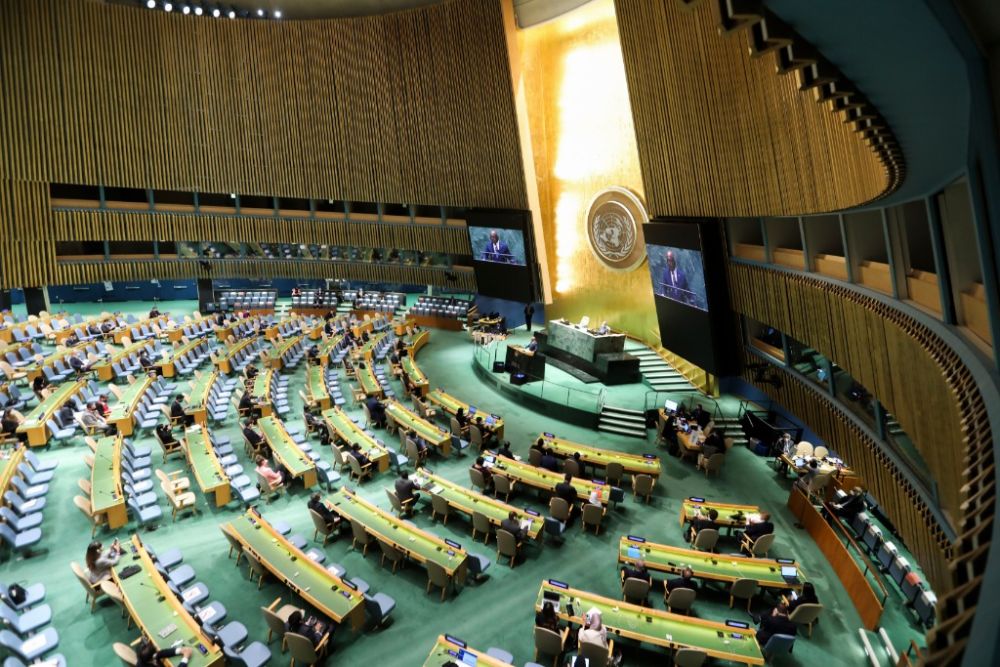 9月27日,在位于纽约的联合国总部,第76届联合国大会主席沙希德发表讲话。(新华社记者王迎摄)