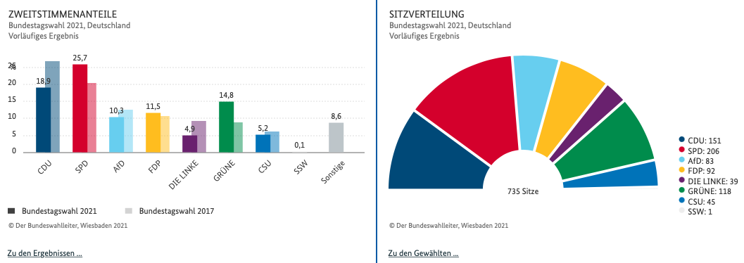 △德国2021年联邦议院选举初步官方结果(左为投票结果;右为席位份额)(图片来源:德国联邦选举委员会)