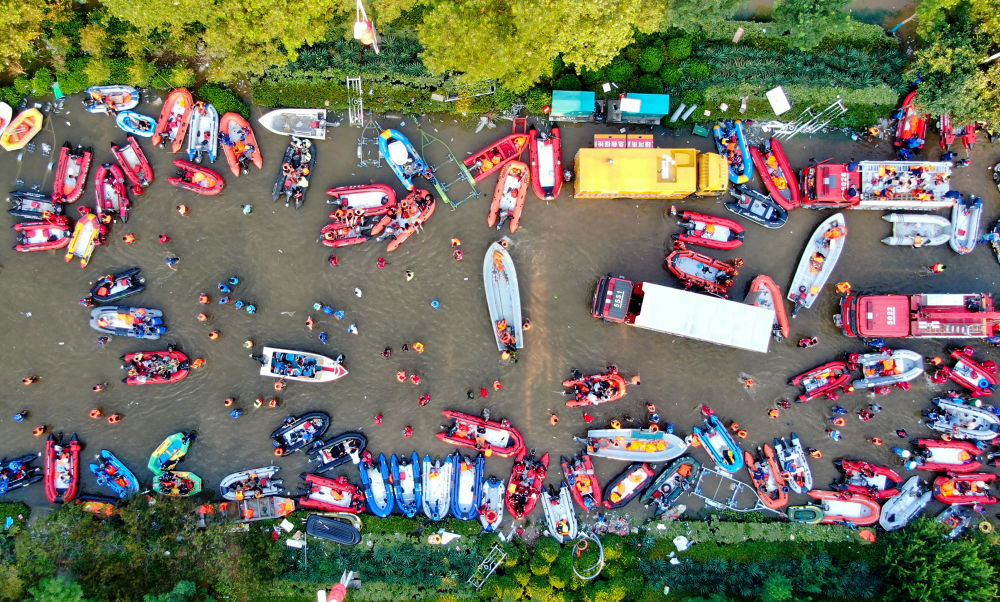 ↑7月26日,全国各地救援力量在卫辉市转移新乡医学院第一附属医院患者(无人机照片)。新华社记者 郝源 摄