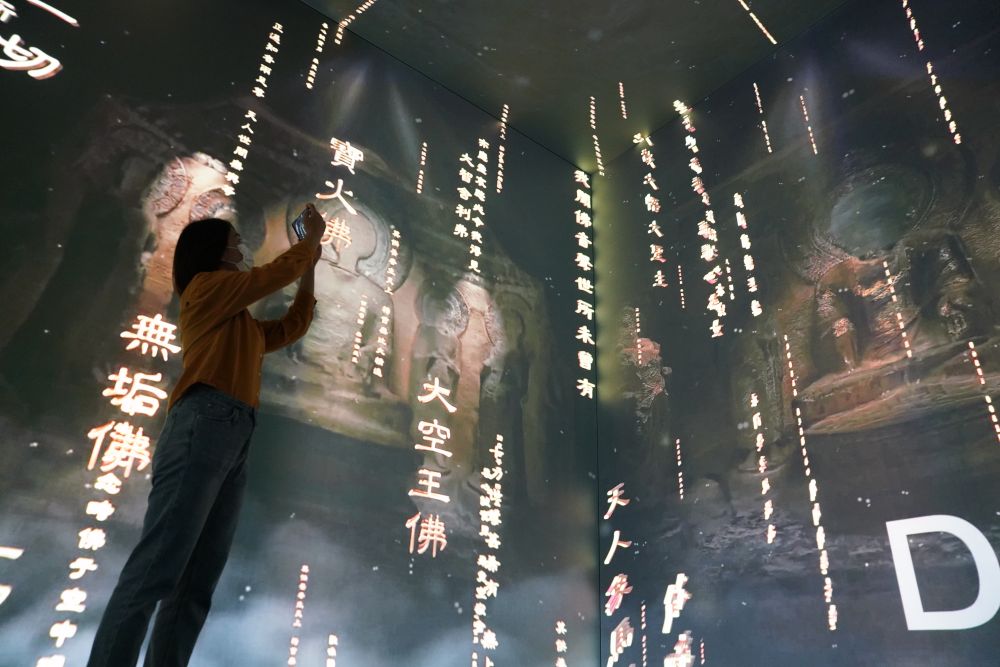 游客正在响堂山石窟数字展示中心,进行数字影像互动体验。