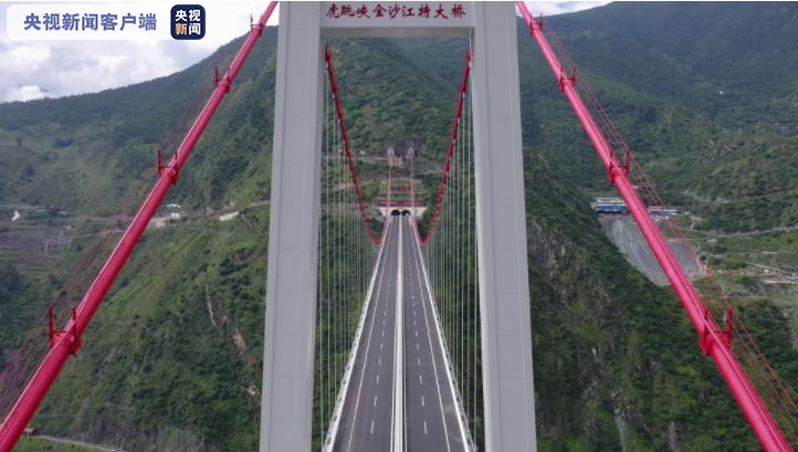 项目建设方云南建投集团副总工程师陈维介绍,虎跳峡金沙江特大桥创造性采用独塔单跨地锚式钢桁梁悬索桥结构,大桥主跨达766米,用钢量8000多吨,相当于埃菲尔铁塔的用钢量,在同类型桥梁中跨度位居世界第一,大桥采用的滚轴式复合索鞍结构在国内外大跨径悬索桥上也是首次采用。虎跳峡地下互通为避让不良地质带,创造性地将桥隧立交从地上搬到地下,实现“桥隧、地下互通”相连,是我国首座高速公路地下互通立交。