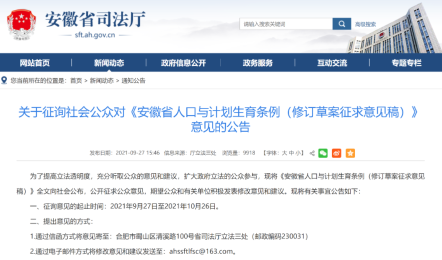 近日,根据安徽省司法厅发布通告,《安徽省人口与计划生育条例(修订草案征求意见稿)》向公众征求意见,征询意见的起止时间:2021年9月27日至2021年10月26日。