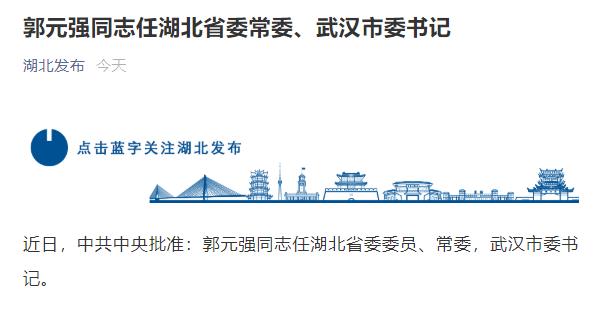 央视网消息:据“湖北发布”微信公众号消息,近日,中共中央批准:郭元强同志任湖北省委委员、常委,武汉市委书记。