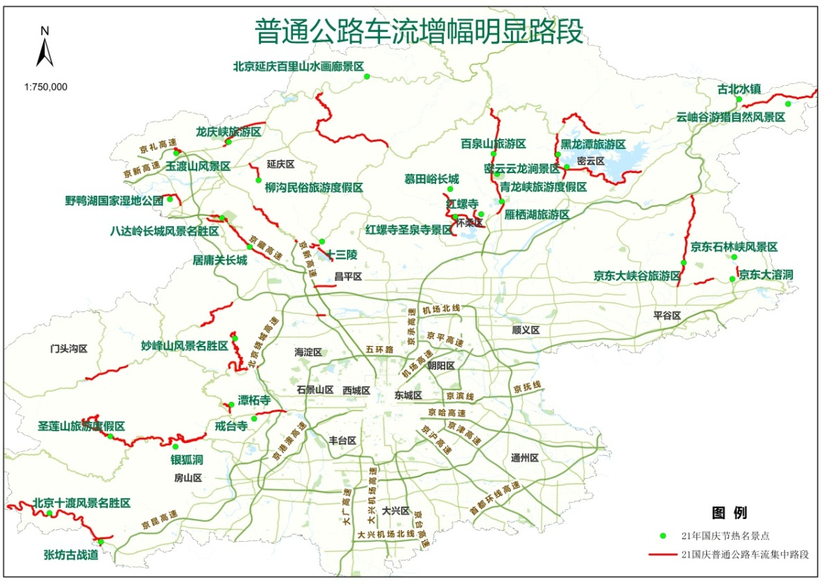 假期期间,北京市域内所有收费公路对7座以下(含7座)载客车辆免收通行费,免费通行时间为2021年10月1日0:00至10月7日24:00。高速公路交通量较平日总体将呈现增长趋势,受疫情反弹等不确定因素影响,预计假期高速公路日均交通量约230万辆,较去年下降5.1%(较2019年上升2.1%),预计峰值将达约246万辆。