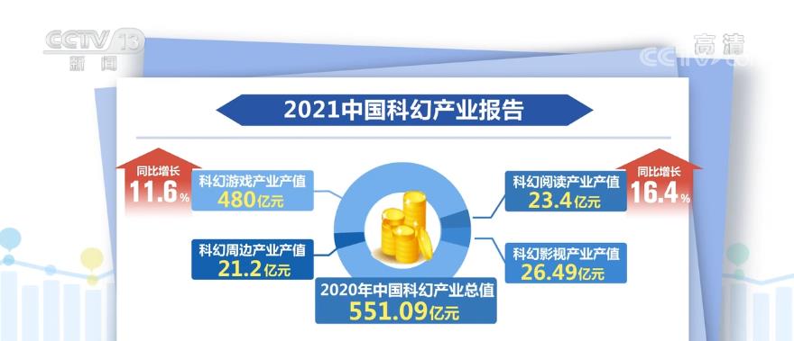 最新发布的《2021中国科幻产业报告》显示,2020年中国科幻产业总值为551.09亿元,其中,科幻阅读产业产值为23.4亿元,同比增长16.4%。科幻影视产业产值为26.49亿元。科幻游戏产业产值480亿元,同比增长11.6%。科幻周边产业产值为21.2亿元,《流浪地球》《三体》等热门科幻IP的周边产品仍占主流。专家分析认为,受新冠肺炎疫情影响,科幻影视产业产值大幅下降,而宅经济发展带动了数字阅读和有声阅读产值增长迅速。