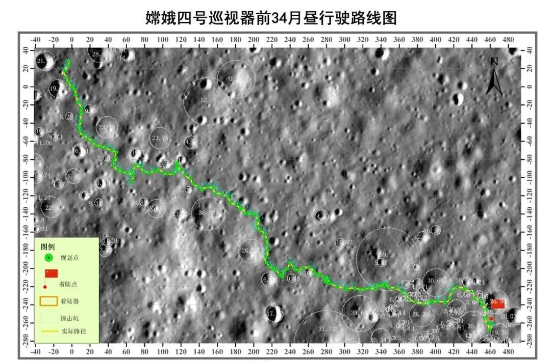 截至目前,玉兔二号月球车累计行驶839.37米,累计获取科学数据3632.01GB,目前处于第34月夜,科学成果将及时发布。(行驶路线图制作:北京航天飞行控制中心)