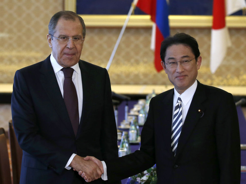2016年4月15日,日本东京,时任日本外务大臣岸田文雄(右)与俄罗斯外长拉夫罗夫握手。(新华社发)