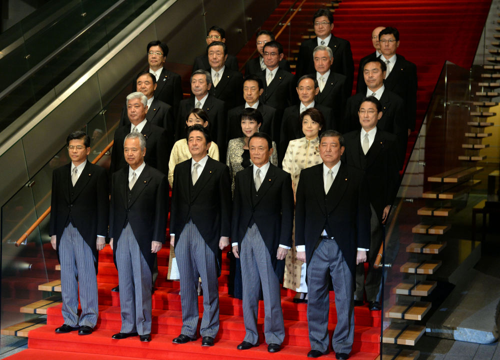 2015年10月7日,东京首相官邸,时任日本首相安倍晋三(前中)与改组后的新内阁成员合影。前排右一为石破茂,右二为麻生太郎,二排右一为岸田文雄,二排中为高市早苗,四排中为河野太郎。(新华社记者马平摄)