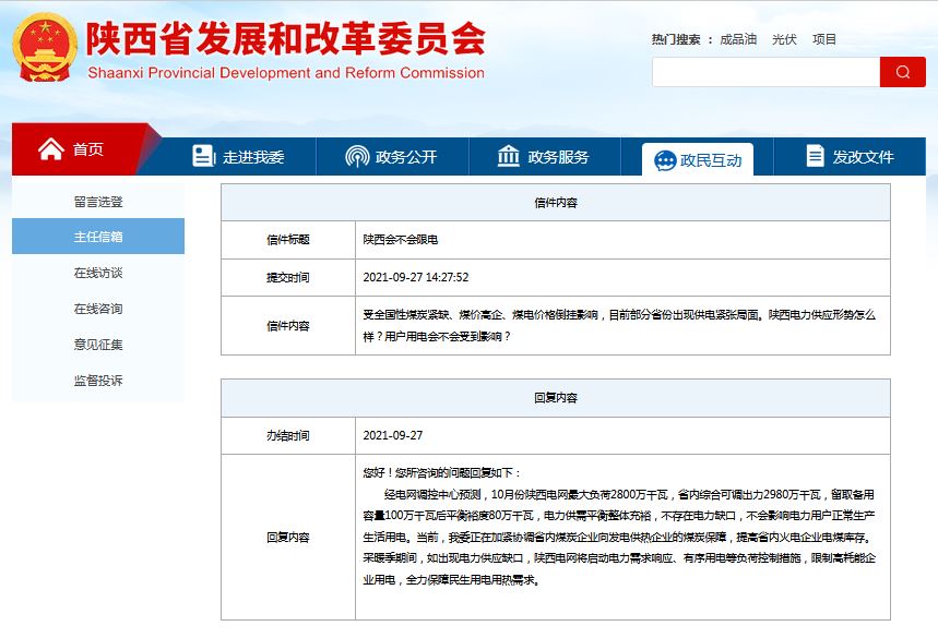 近日一些地方拉闸限电,引发社会对冬季能源保供的担心。近日,有网友在陕西省发改委官网留言询问,陕西当前电力供应形势如何,用电是否会受到影响。陕西省发改委官网回复,目前陕西电力供需平衡整体充裕,不存在电力缺口,不会影响电力用户正常生产生活用电。