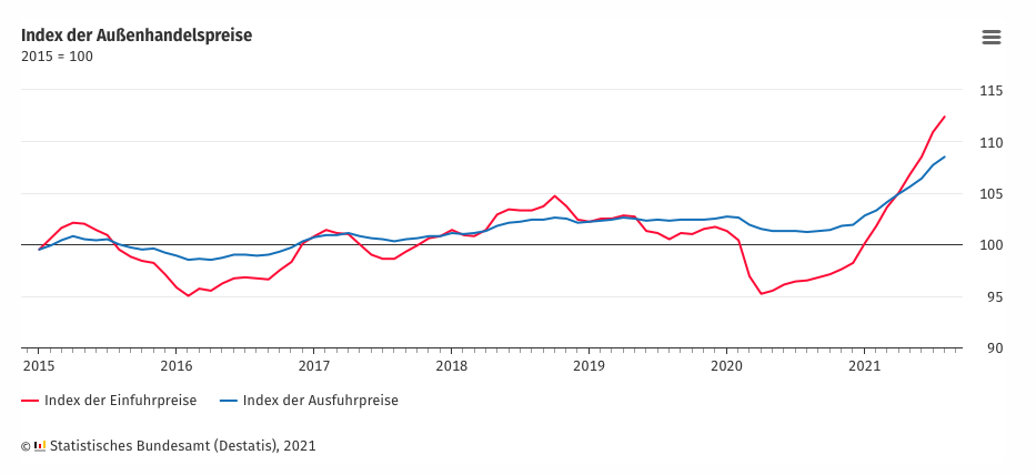 △德国进出口物价变化趋势(红线为进口物价,蓝线为出口物价)(图片来自德国联邦统计局)