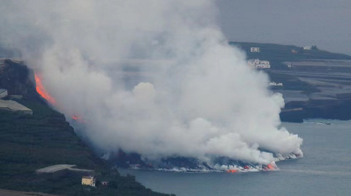 据西班牙当地媒体9月29日报道,西班牙拉帕尔马岛火山喷发产生的熔岩流已于当地时间28日晚11时左右,抵达位于塔扎科尔特镇附近的海岸,从近100米的高度流入海中。熔岩与海洋接触产生的烟雾,在海风的作用下进入陆地。
