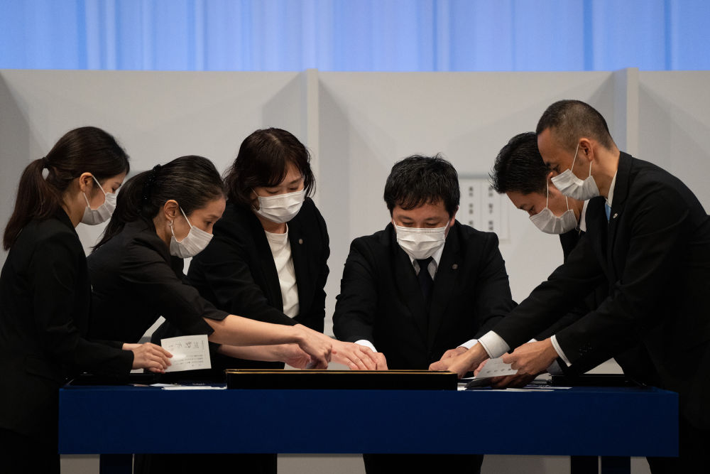9月29日,在日本东京,工作人员在选举现场清点选票。新华社发(Pool图片/卡尔·考特摄)