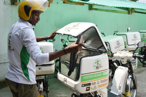 在喀麦隆杜阿拉,农产品电商手机应用AgriApp的快递员准备配送活鱼。新华社发(科普索摄)
