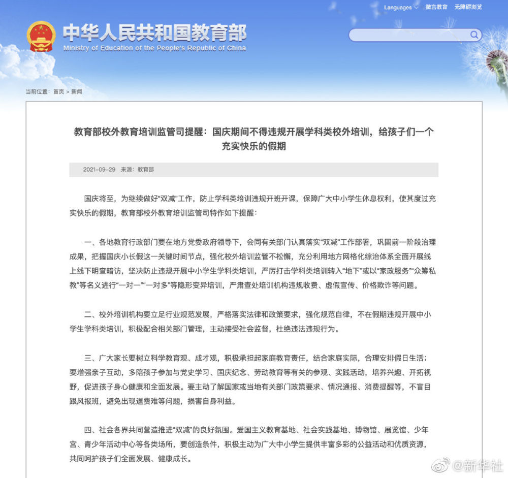 教育部:国庆期间不得违规开展学科类校外培训