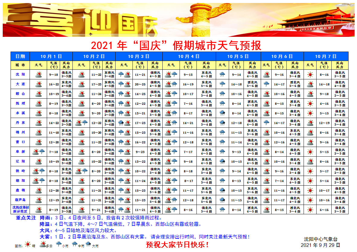 其中10月3日将出现强对流天气,4日夜间至5日,本溪、丹东、葫芦岛地区有暴雨,其他地区有中雨到大雨;假日期间气温先高后低,4日全省各地气温将下降6至8℃,7日早晨,东西部山区将出现霜或轻霜;10月1日至7日,辽宁海域将出现7到10级阵风,需注意防范。