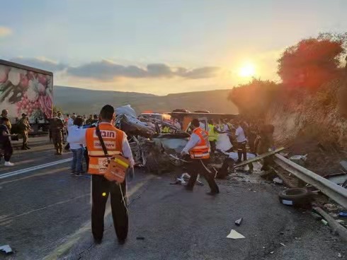 当地时间9月29日下午,以色列北部某公路上,一辆满载40名乘客的公交车撞上一辆出租车和一辆私家车,导致公交车翻车,一名男子被压在公交车下死亡,公交车上多名乘客受伤;出租车上的妇女和她的3名子女当场死亡,出租车司机重伤。