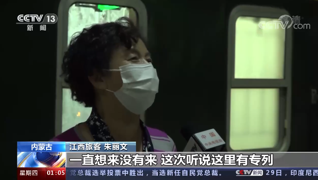 江西旅客 朱丽文:很多次都在网上看祖国的胡杨林,一直很想来没有来,这次听说这里有专列,那我就跟着一起过来了。